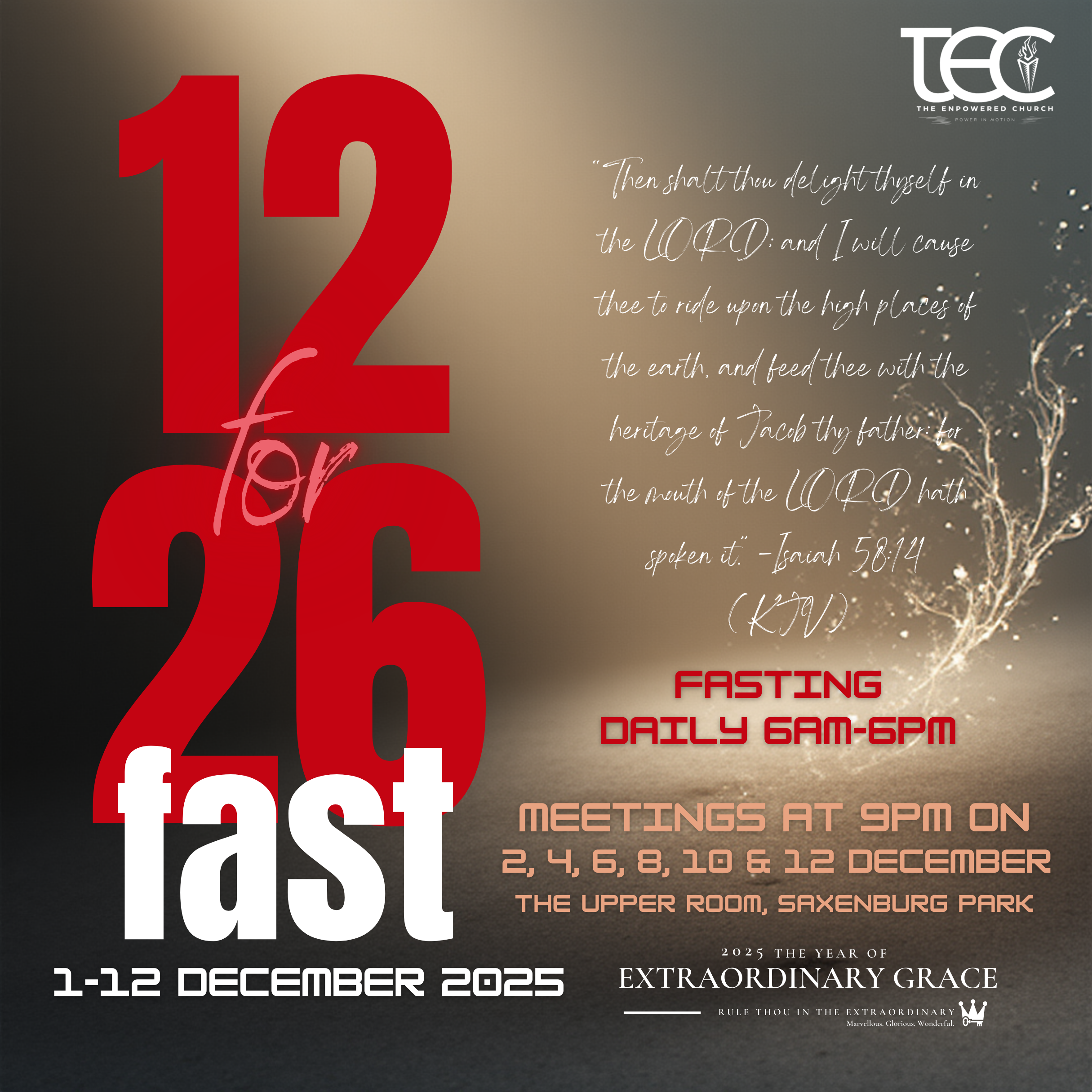 Join us for 12 for 26 Fast, 1-12 December 2025, 6AM-6PM Daily. Meetings at 9pm on 2, 4, 6, 8, 10 & 12 December 2025.