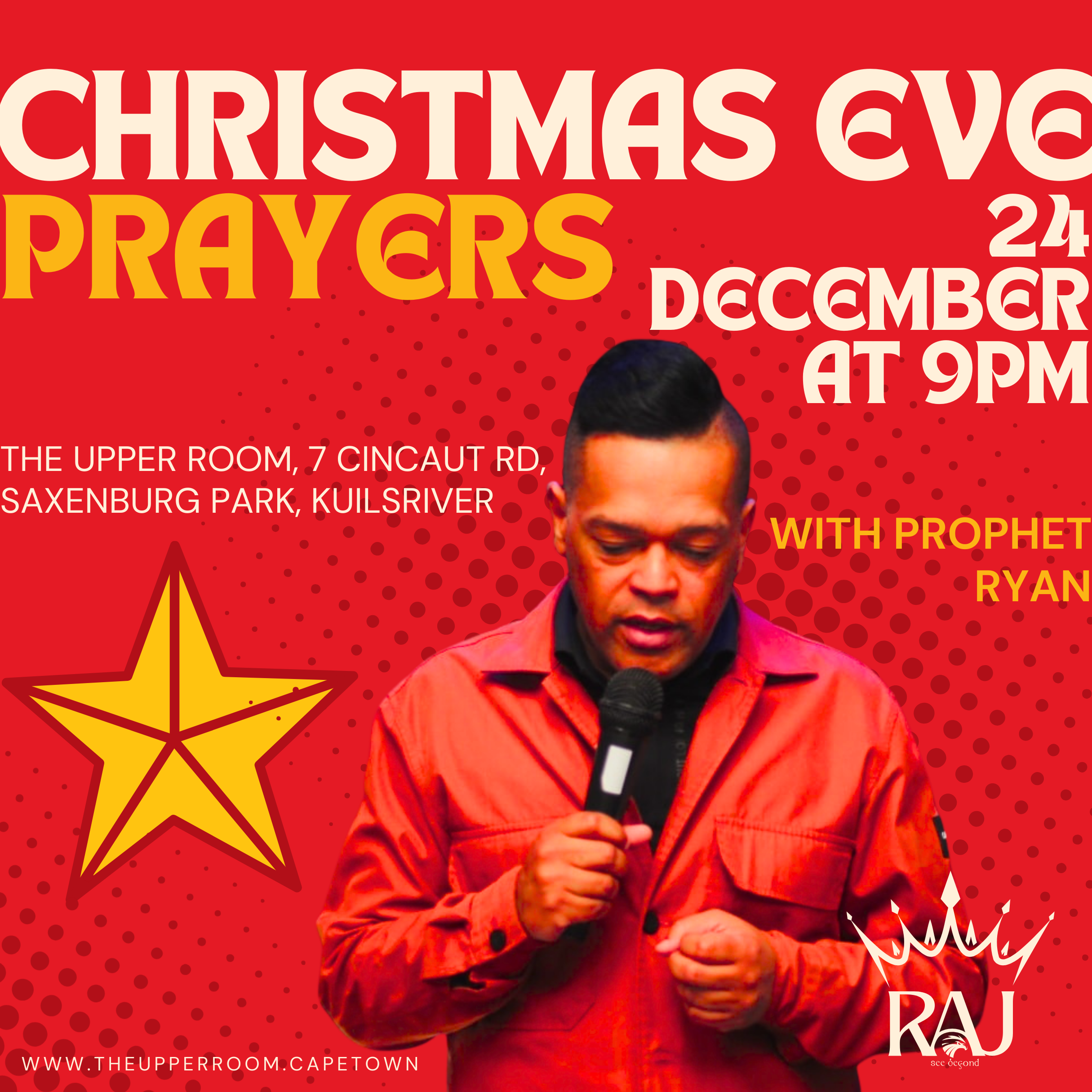 Christmas Eve Prayers Join us for the Christmas Eve Prayers with Prophet Ryan Dress code: Casual + Add to Google Calendar + iCal / Outlook export 00 days 00 hours 00 minutes 00 seconds Date Dec 24 2025 Time 9:00 pm - 11:30 pm Local Time Timezone: America/New_York Date: Dec 24 2025 Time: 2:00 pm - 4:30 pm Location The Upper Room 7 Cincaut Rd, Blackheath, Cape Town, 7580 Organizer Ryan Jacobs Email connect@ryanjacobs.info Website https://ryanjacobs.info Share this event