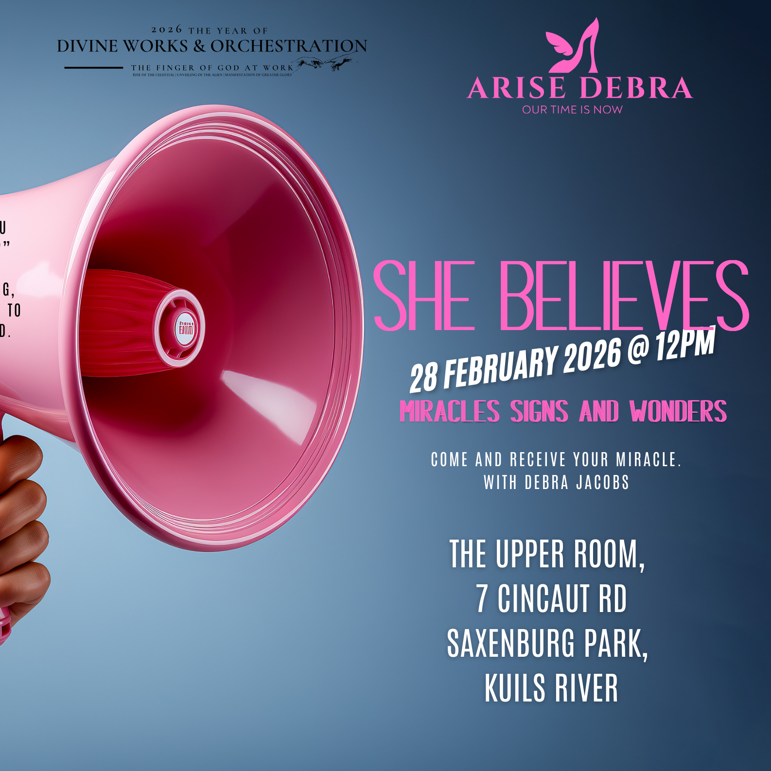 Join us for She Believes – Miracles signs and wonders, with Debra Jacobs. Come and receive your miracle.